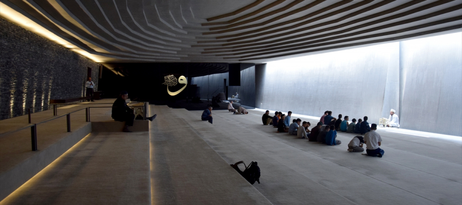 صممت الجدران الخارجية للمسجد في هيئة توحي وكأنها تضع حداً بين العالم الخارجي المختلط المضطرب وأجواء الخشوع والطمأنينة والهدوء داخل المسجد.