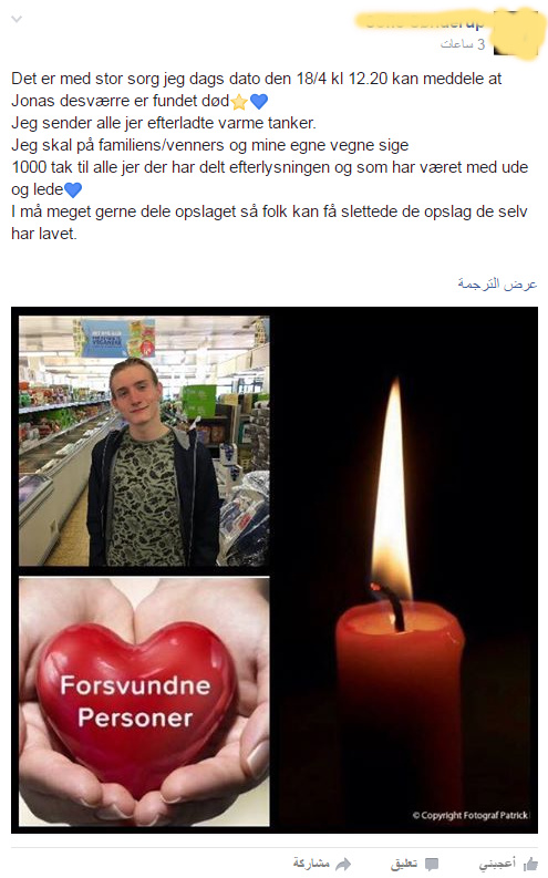 ومن جهة أخرى نشرت مجموعة Forsvundne personer على الفيس بوك التي تهتم بالأشخاص المفقودين في الدنمارك