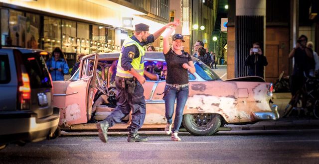 غزت صورة شرطي سويدي قام بايقاف حركة المرور في وسط ستوكهولم بعد طلبه الرقص من احدى الفتيات معه مواقع التواصل الاجتماعي .